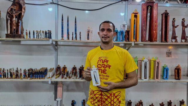 Entre imagens de santos e a presença de jovens dedicados, a fé se faz matéria no 40º Salão de Artesanato Paraibano que tem como tema “Macramê – A arte de arrochar o nó“. Instalado na Avenida Severino Bezerra Cabral, 780, em Campina Grande. O evento recebe centenas de visitantes diariamente, das 15h às 22h, até o dia 29 de junho, mas o que se faz presente mesmo não é só comércio: é devoção. Segundo informações do Governo da Paraíba, esse ano, o salão contará com cerca de 400 artesãos e pretende movimentar R$3 milhões. A entrada é gratuita, mas a organização pede a doação de 1kg de alimento como gesto solidário.